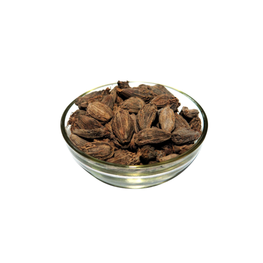 Black cardamom, also known as hill cardamom or badi elaichi, is a robust spice with a smoky aroma and a bold, earthy flavor. Unlike its more common counterpart, green cardamom, black cardamom has larger pods with dark brown to black husks. It is often used in savory dishes, particularly in Indian and East Asian cuisines, to impart depth and complexity. Black cardamom pods are typically used whole or crushed to release their intense flavor, adding a distinctive touch to curries, stews, and rice dishes.