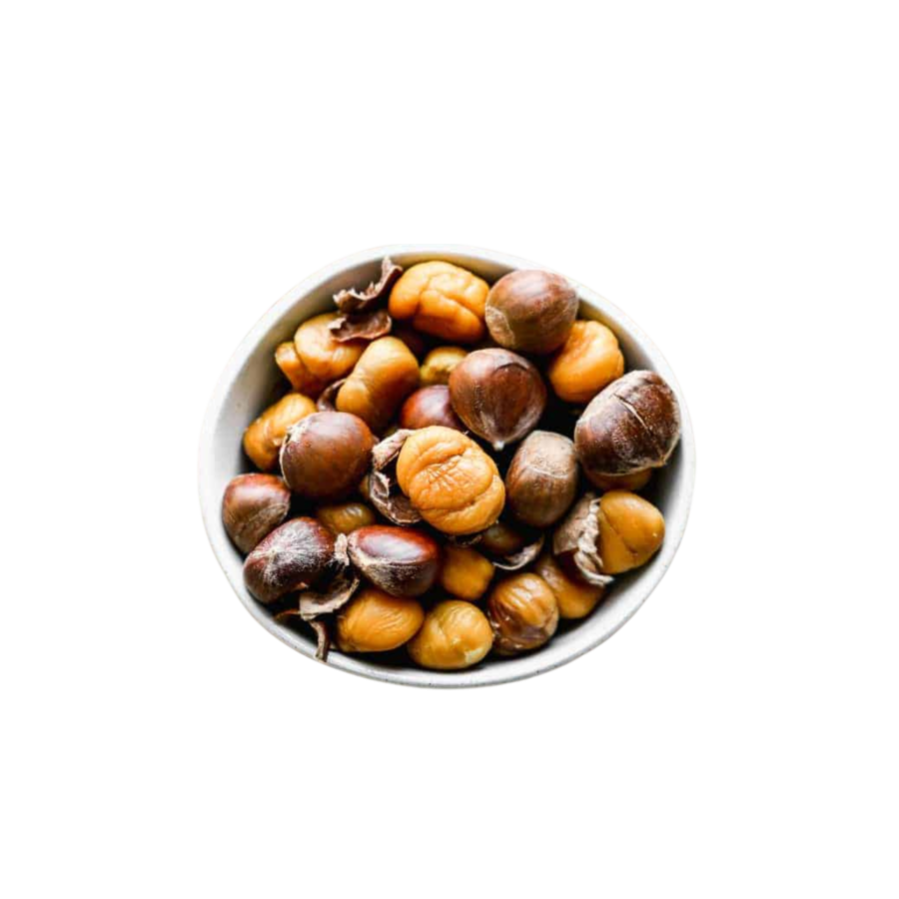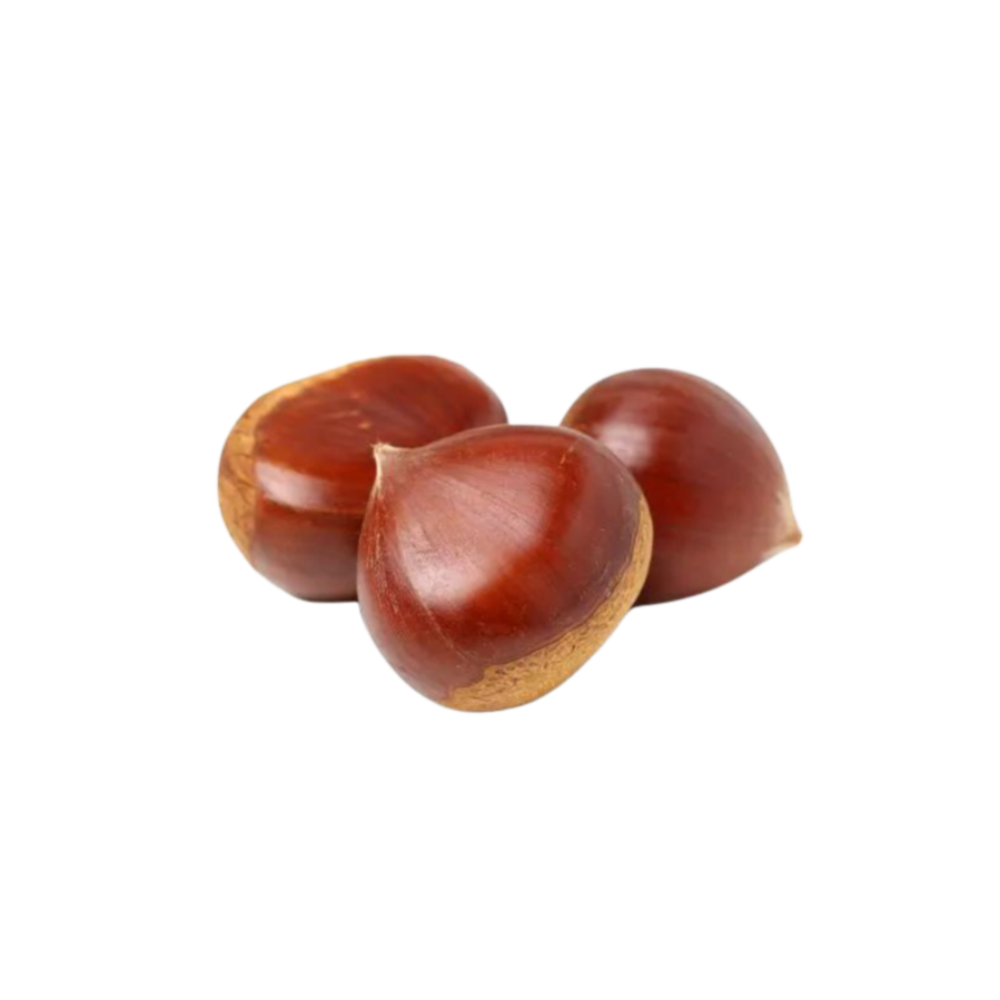 Chestnuts are starchy nuts derived from trees in the genus Castanea. They have a sweet, nutty flavor and a creamy texture when cooked. Chestnuts are commonly roasted, boiled, or used in dishes like stuffing, soups, and desserts.