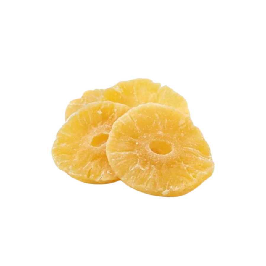 Dry pineapple is pineapple fruit that has been dehydrated, resulting in a chewy and sweet-tart snack. These dried pineapple pieces retain the tropical flavor of fresh pineapple but with a more concentrated taste. They are enjoyed as a standalone snack, added to trail mixes, or used in cooking and baking to add a burst of fruity flavor. Rich in vitamins, minerals, and antioxidants, dry pineapple is not only delicious but also nutritious.
